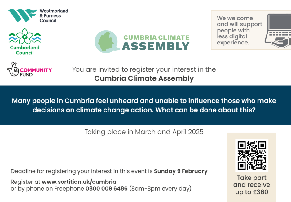 8,000 mail invitations were sent to households across Cumbria. These addresses were randomly selected from the Royal Mail database. Each of these addresses received a letter in the post inviting residents to sign up as potential members of the Cumbria Climate Assembly.