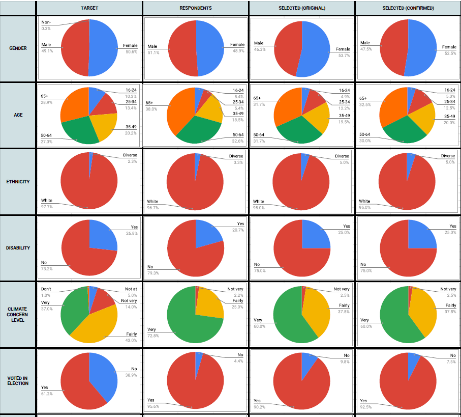As part of the sign-up procedure, all potential participants were required to share some information about themselves. We asked them to share their address, their date of birth, their gender identity, their ethnicity and whether they have a disability. We also asked some attitudinal and behavioural questions, namely their attitude towards climate change; whether they had voted in an election; if they had signed a petition; if they had written to their MP; whether they had been involved with a political party; if they had organised in their local community; and if they had taken part in a street protest. We then used this information to perform a democratic lottery. Details of the specific algorithm we use, including information about the fairness of the algorithm, can be found here. During the process of confirming participants, people dropped out and they were replaced by lottery to maintain the demographic make-up of the assembly. Below are some of the results, you can download the full set of categories used for stratification here.
