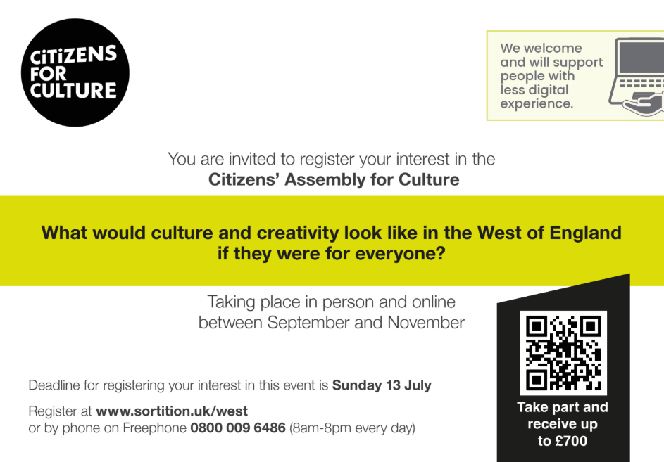15,000 mail invitations were sent to households in Bath, North East Somerset, Bristol, North Somerset and South Gloucestershire. These addresses were randomly selected from the Royal Mail database. Each of these addresses received a letter in the post inviting residents to sign up as potential members of the Citizens' Assembly for Culture.