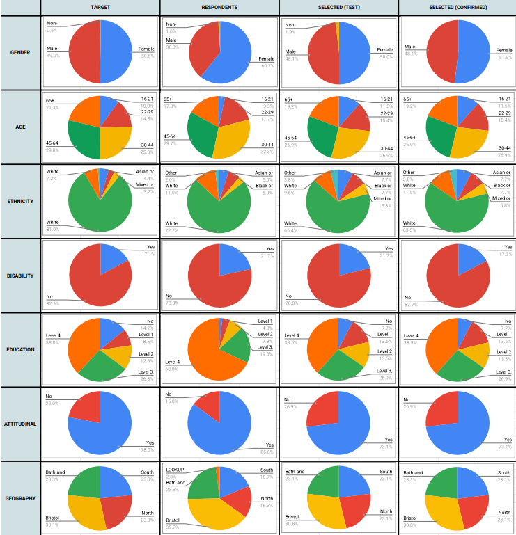 - Column 2 (Respondents): These pie charts summarise the information that was provided to us by the 300 people who signed up as potential participants for the Citizens Assembly for Culture. There is some skewing in statistics here compared with our target: for instance, only 3.3% of respondents were aged between 16 and 21.
